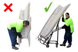 - heavy duty wheels for all day use. Equipped with a chair brace to safely distribute weight and support stack while moving.